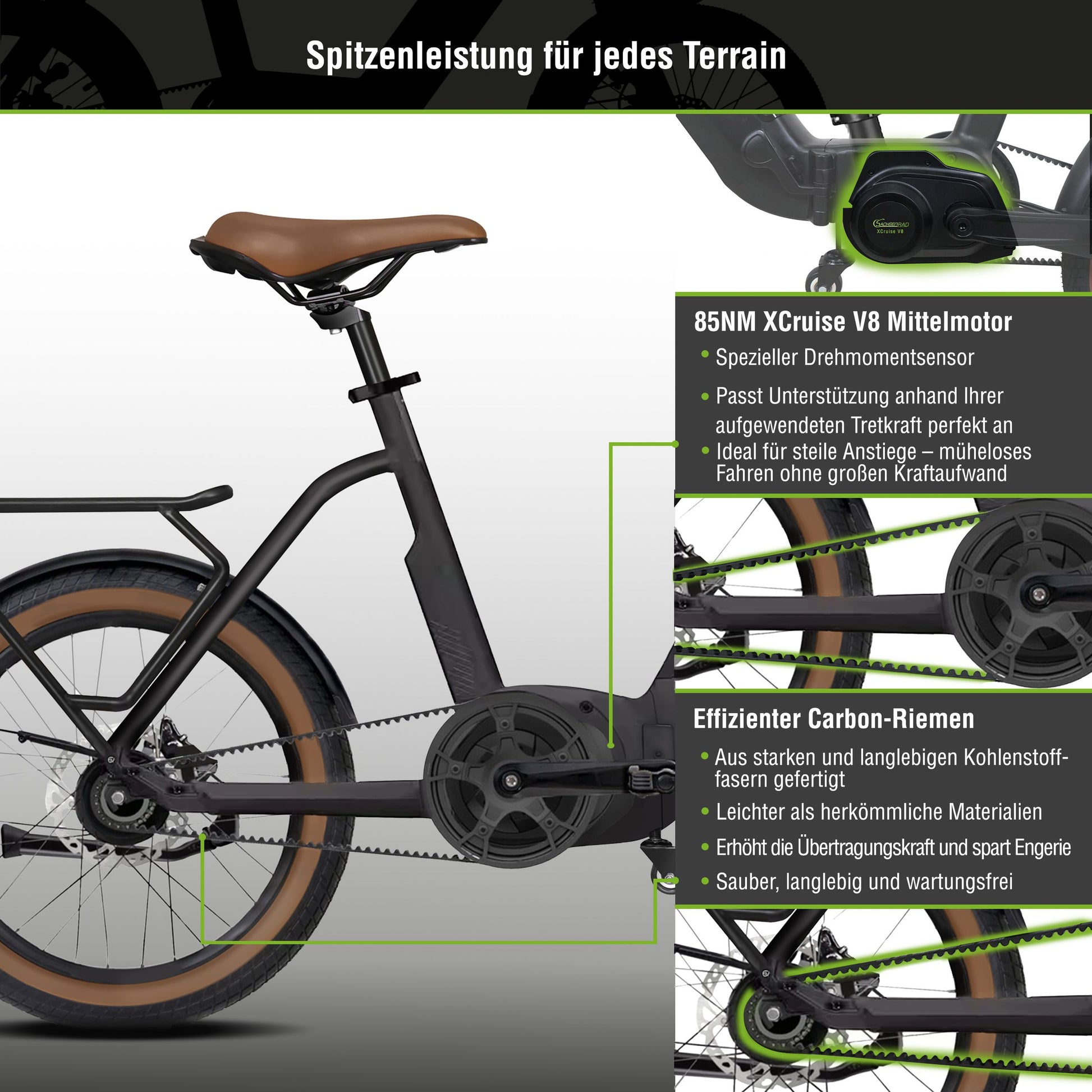 Ausgestattet mit dem leistungsstarken XCruise V8 Mittelmotor, der mit 85 Nm Drehmoment für kraftvolle Unterstützung sorgt, passt sich das F3G Centro dank eines speziell entwickelten Drehmomentsensors optimal an die aufgewendete Tretkraft an. Dies garantiert eine komfortable, effiziente Motorunterstützung, egal mit wie viel Power Sie in die Pedale treten.
