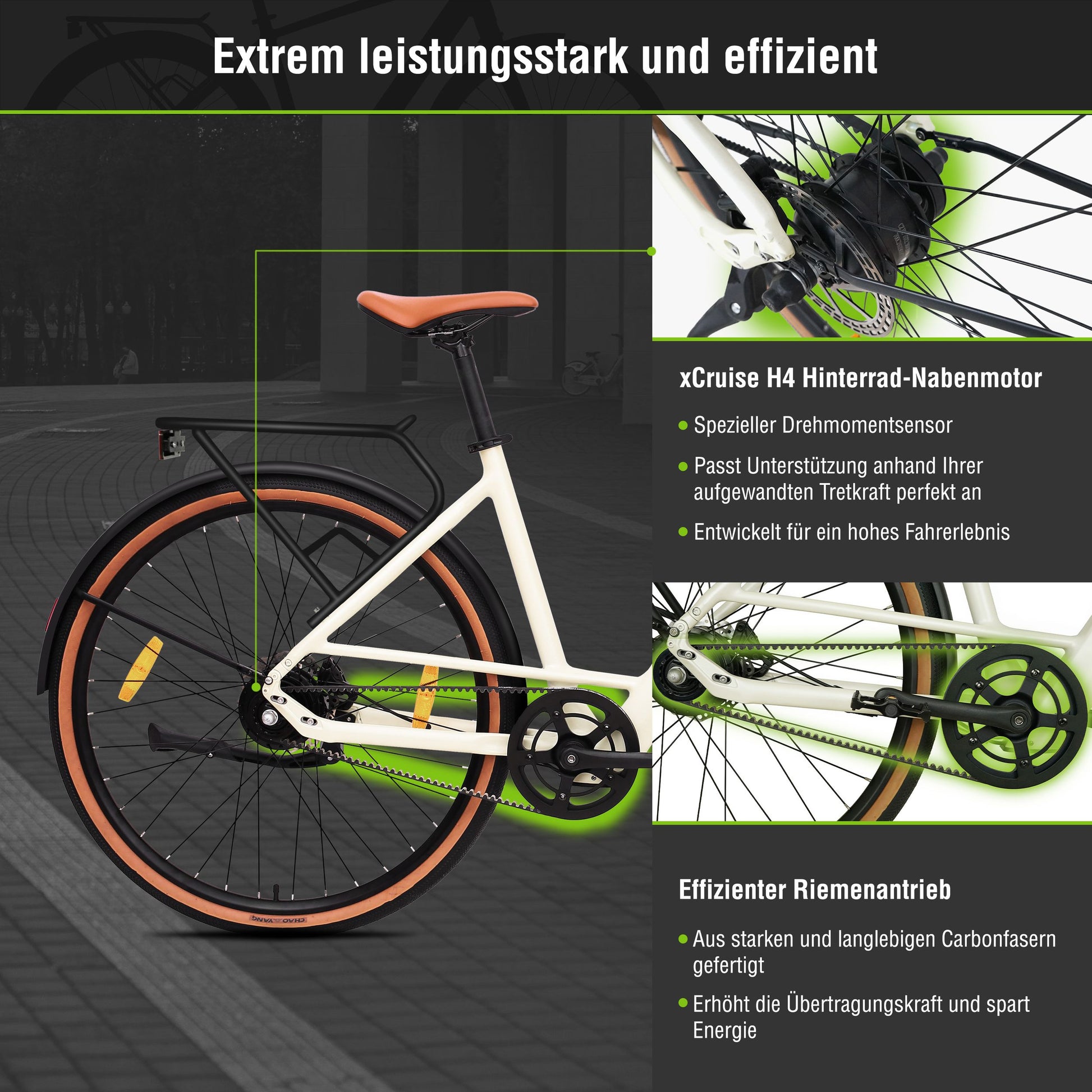 im Lenkerkopf integriertes LCD-Steuerdisplay, Controler mit KI unterstützer Smart-Stufe, Riemenantrieb, LED-Beleuchtung mit StVZO-Zertifizierung, Rücklicht in Schutzblech integriert, Klingel, Gepäckträger, kostenlose Alarmanlage