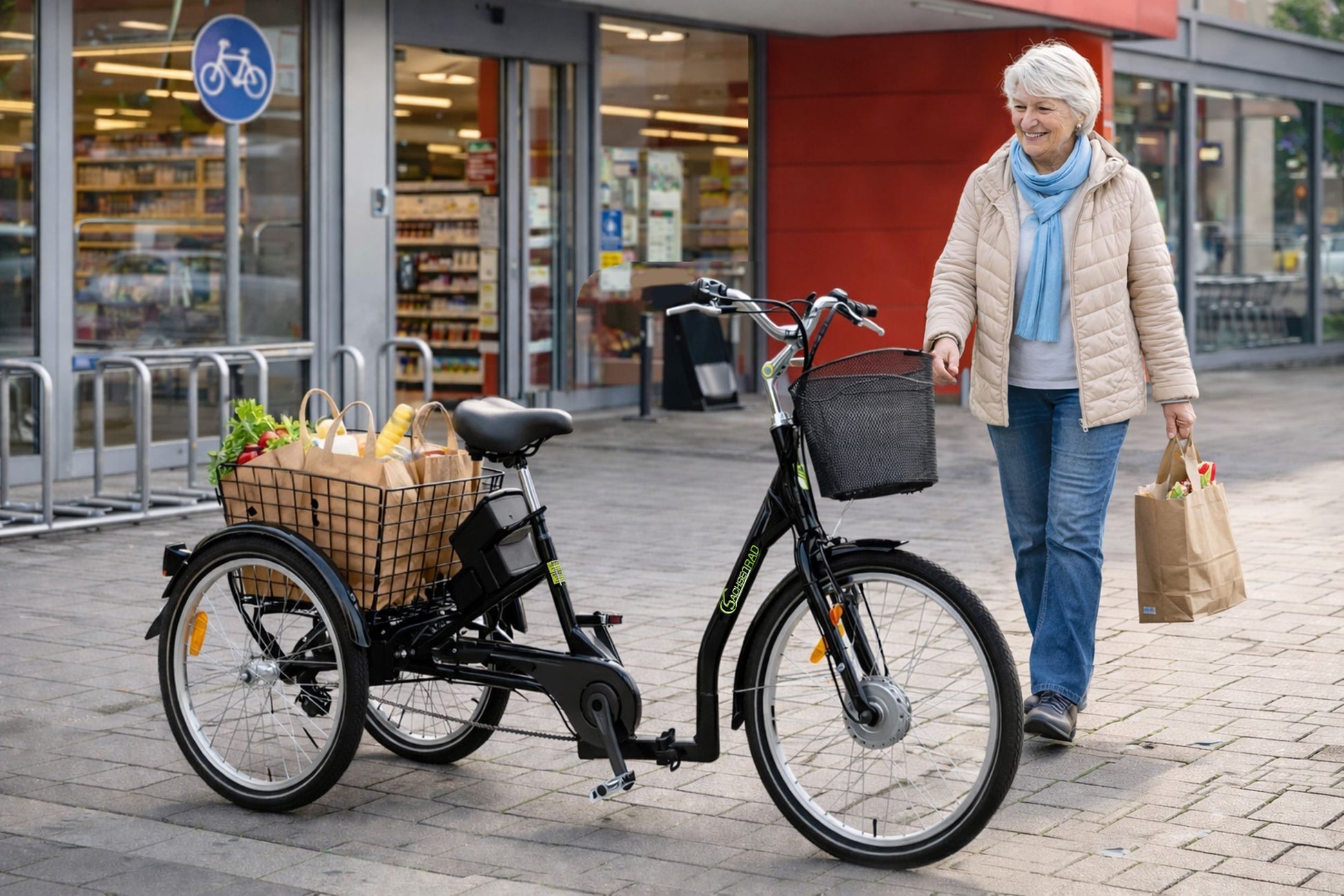 Lassen Sie einfach mal Ihr Auto stehen: Der großzügig dimensionierte Warenkorb zwischen den Hinterrädern bietet Platz für jede Besorgung – egal ob schwere Getränkekästen vom Supermarkt, Farbeimer vom Baumarkt oder Tüten aus dem Shopping Center. Die stabile Bauweise, das Differential und die leistungsstarken Bremsen sorgen dafür, dass Sie auch bei hoher Zuladung jederzeit sicher unterwegs sind. Sparen Sie sich die Parkplatzsuche und kommen Sie dank des 250W starken Elektromotors immer entspannt an. Und für den Fall, dass der Platz nicht reicht oder Sie wichtige Gegenstände im Blick behalten möchten, steht Ihnen zusätzlich ein praktischer Korb am Lenker zur Verfügung.