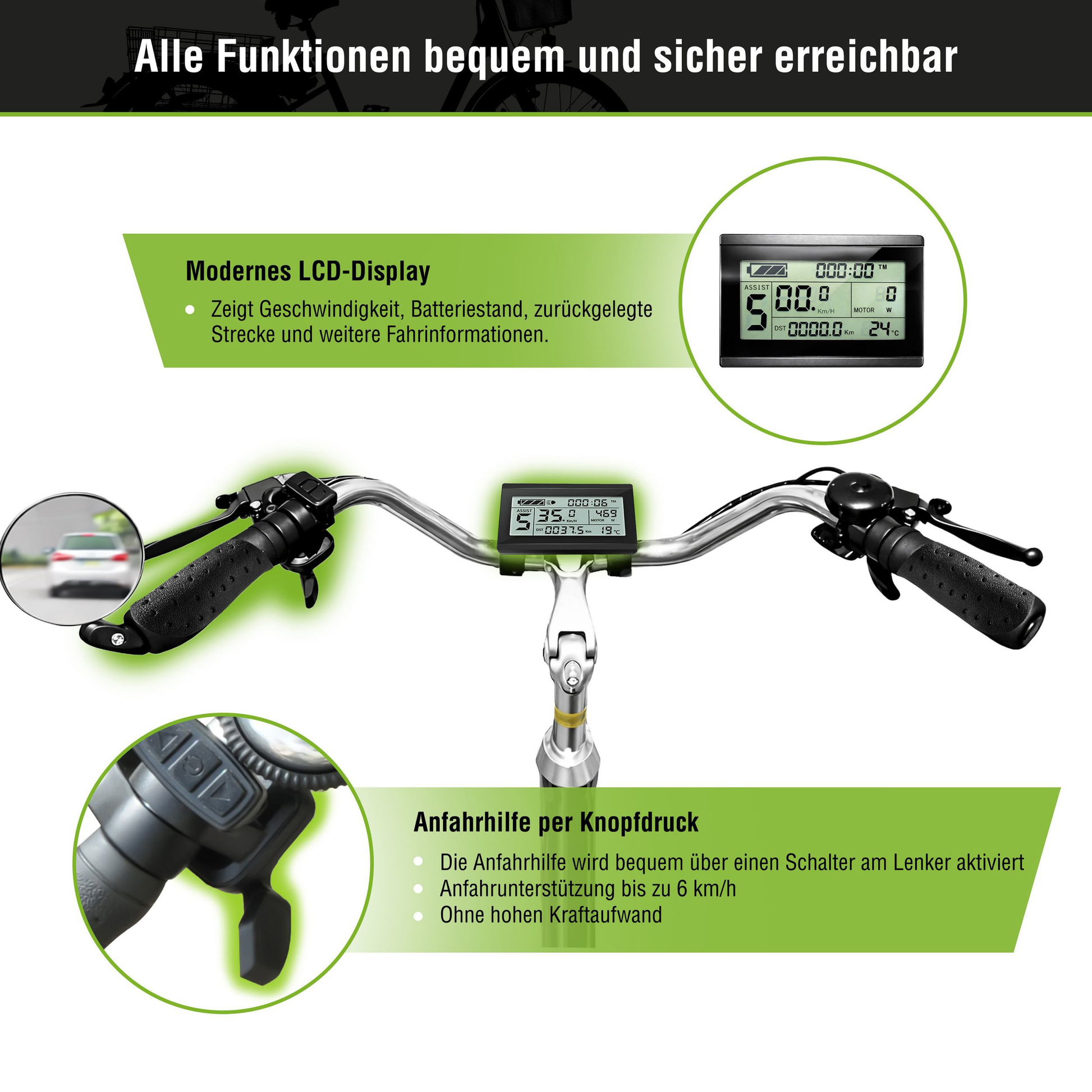 Ausstattung Lastenkorb, Lenkerkorb, Klingel, klappbarer Rückspiegel, Feststellbremse, Fahrradständer