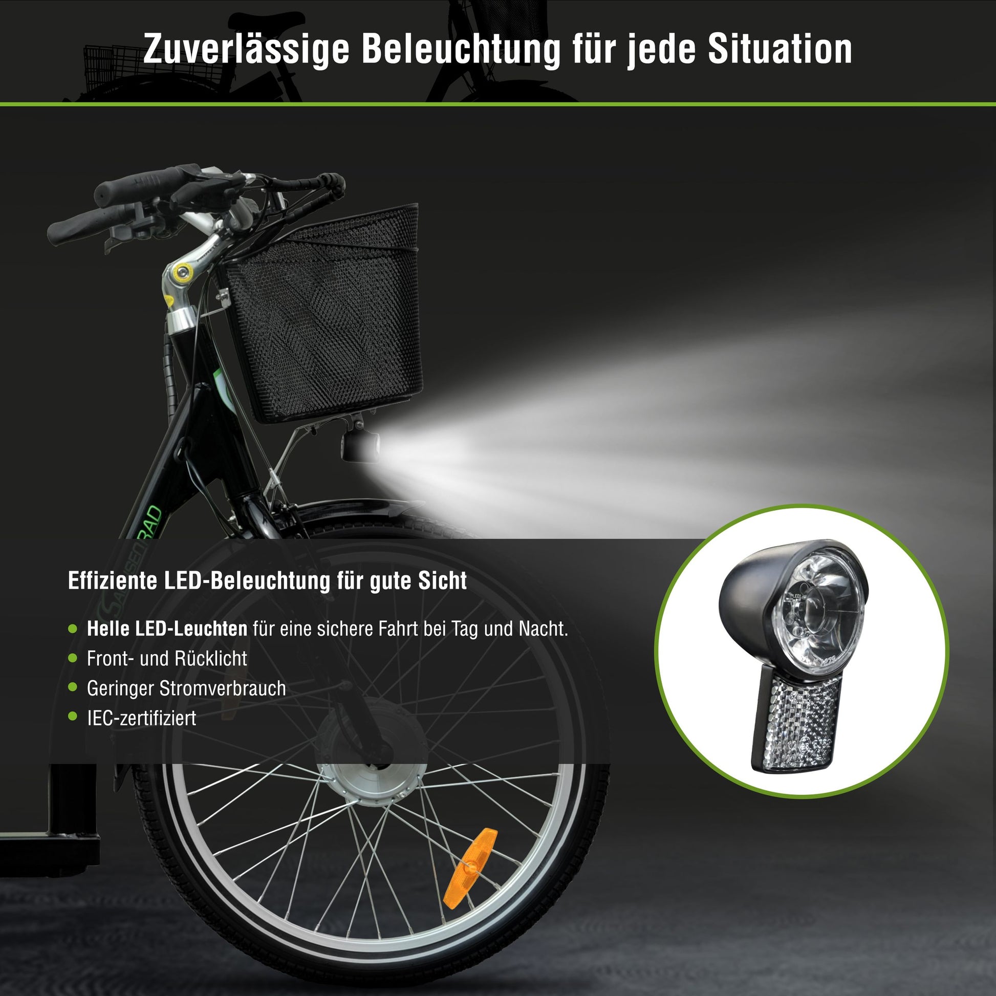Frontlicht mit LED (40 Lux, Nachtfahrlicht, Dauerlicht), Rücklicht mit LED (Bremslicht, Standlicht), Standlicht vorne, hinten